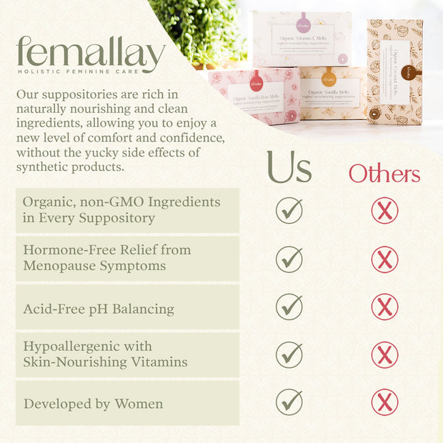 Naturally nourishing and rich in vitamins A & E, Femallay’s vaginal suppository melts were crafted with your well-being and pleasure in mind. Luxurious illipe butter and lavish botanical oils work together in these melts to deliver long-lasting moisture while also helping to restore skin elasticity!